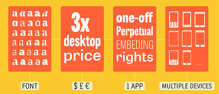 At TypeTogether we want to help small companies with promising ideas for new apps that make our lives more fun or even better. To make things easier for developers we are offering a straightforward pricing-model for embedding typefaces into mobile applications: pay 3x the price of a desktop license and get ‘perpetual-embedding-rights’ for the mobile app you are developing, on all platforms and devices.