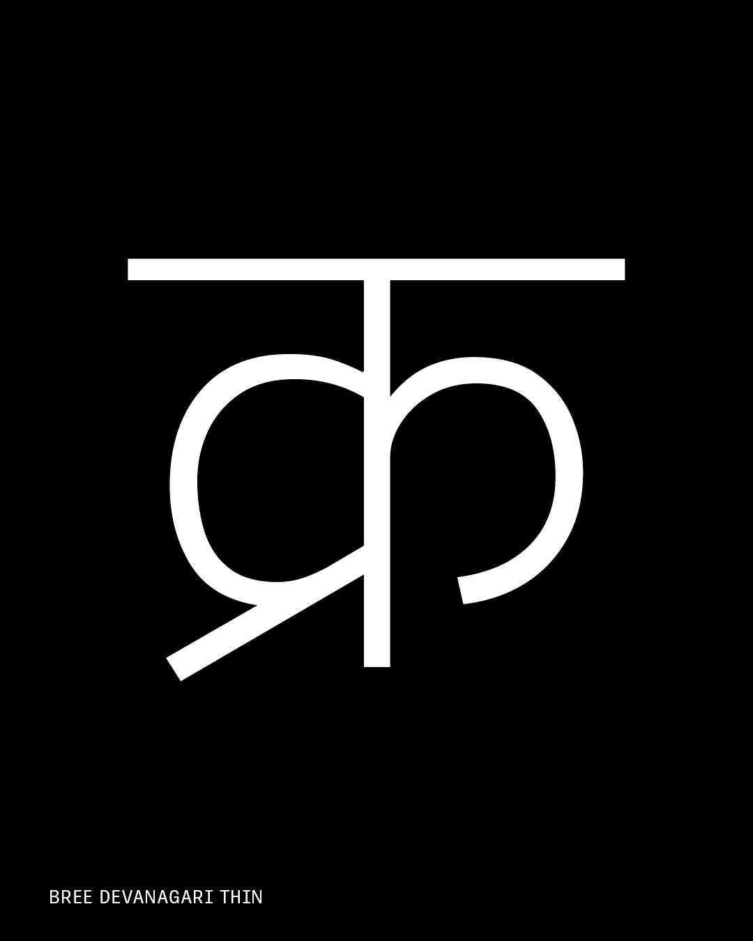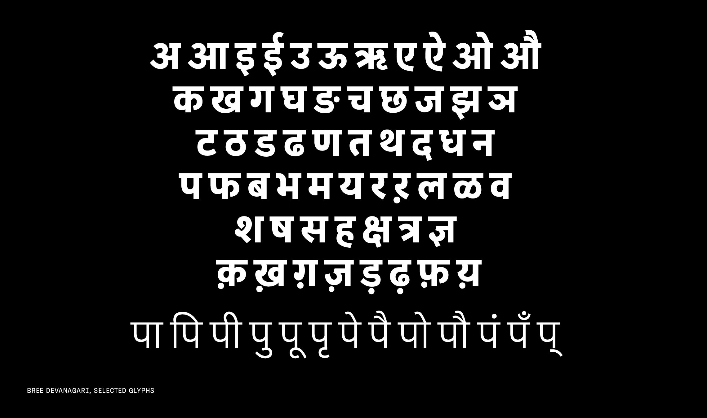 While Bree Devanagari’s inspiration comes from its Latin counterpart, the design team led by Pooja Saxena took special care with Devanagari letterforms. The result is an impressive palette that can go from scant in the thin weight to bursting in the extrabold.