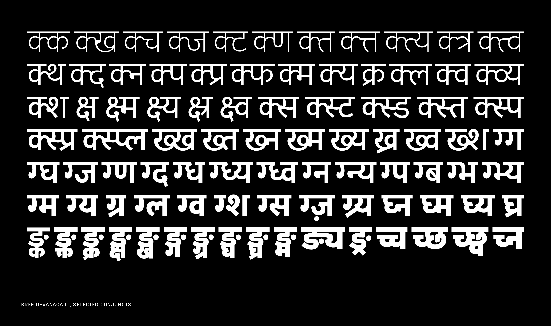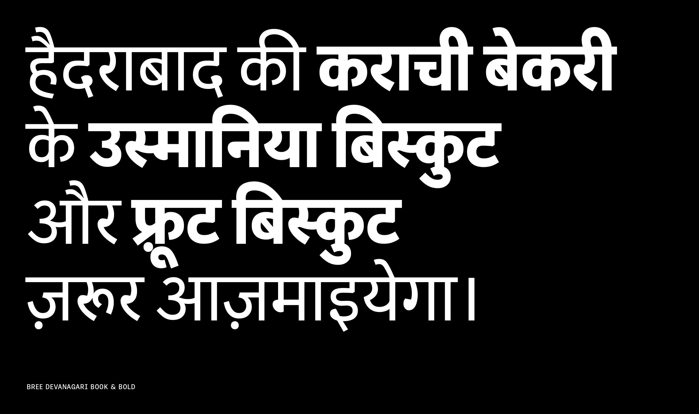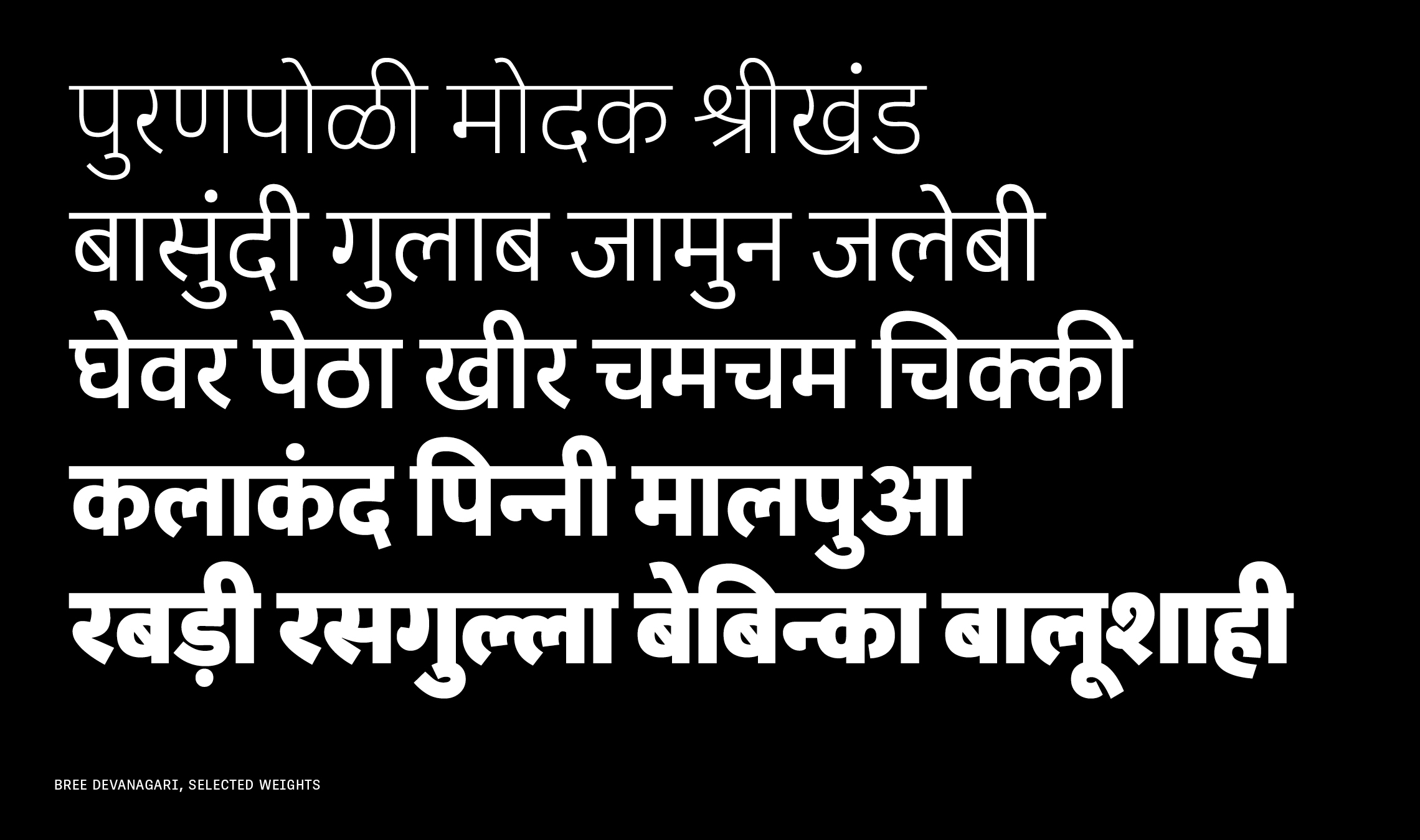 Bree Devanagari will be released in seven weights, including its gregarious extrabold. Designers will love its versatility and its friendly, easygoing nature. We think Bree Devanagari will find numerous uses in logos, packaging, branding, and headlines, while its text weights encourage reading in longer settings.