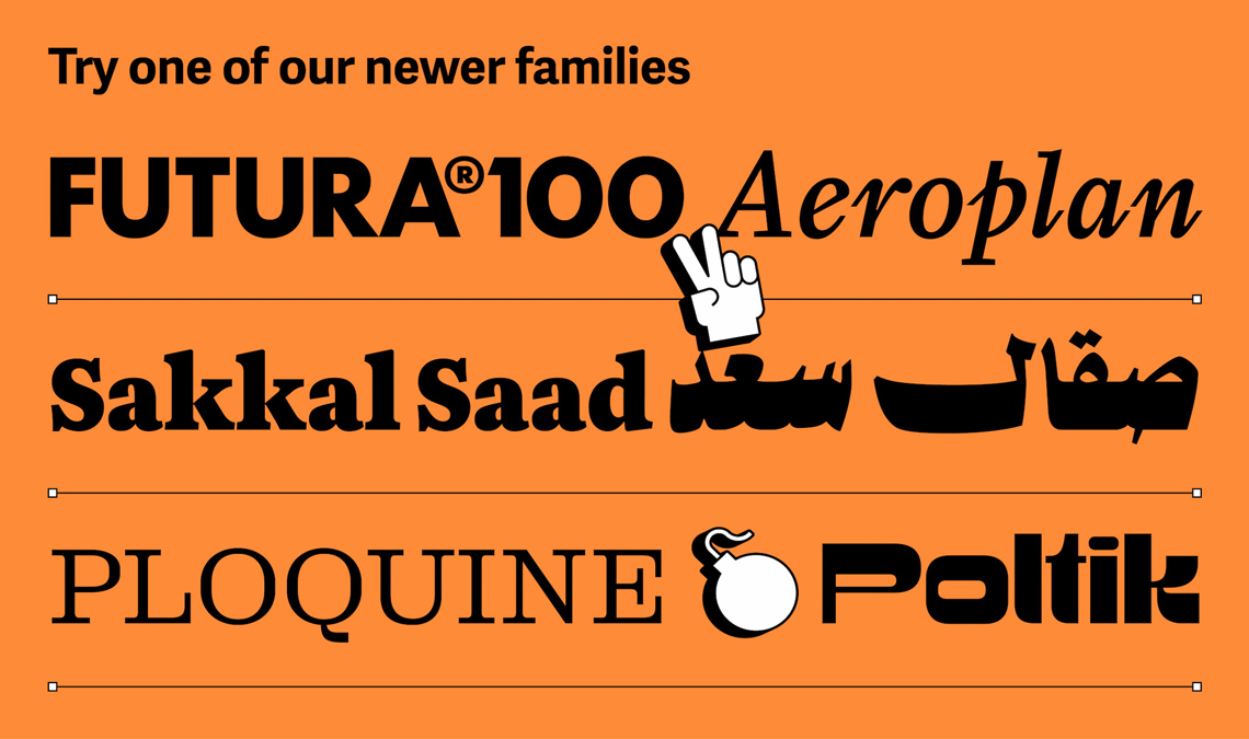 Try one of our newer families, like the expanded multiscript Futura®100, the funky Poltik or the expressive Sakkal Saad. Or grab something from our winners circle, like pairing the unique Sanserata with Alverata, Playpen Sans with Rezak, Bely with Lektorat, or the trusted editorial bundle of Aneto, Belarius, and Catalpa. The sky’s the limit.