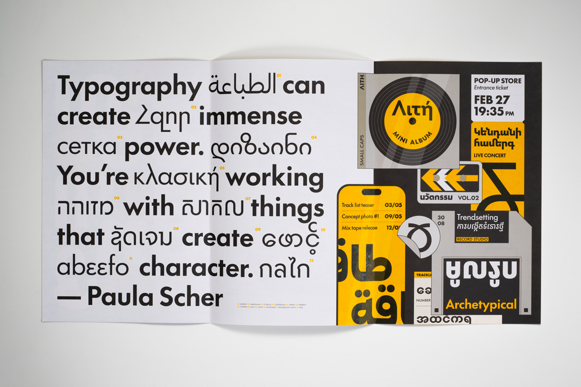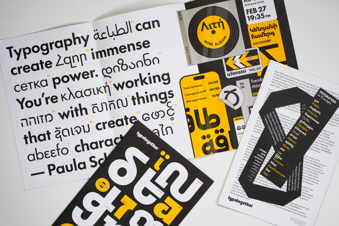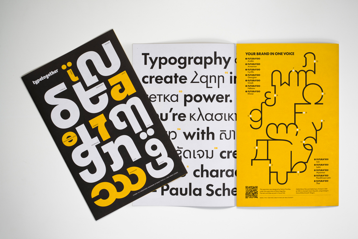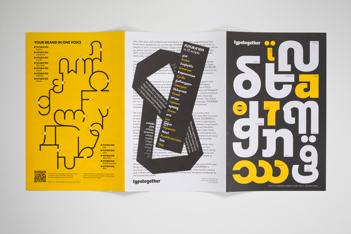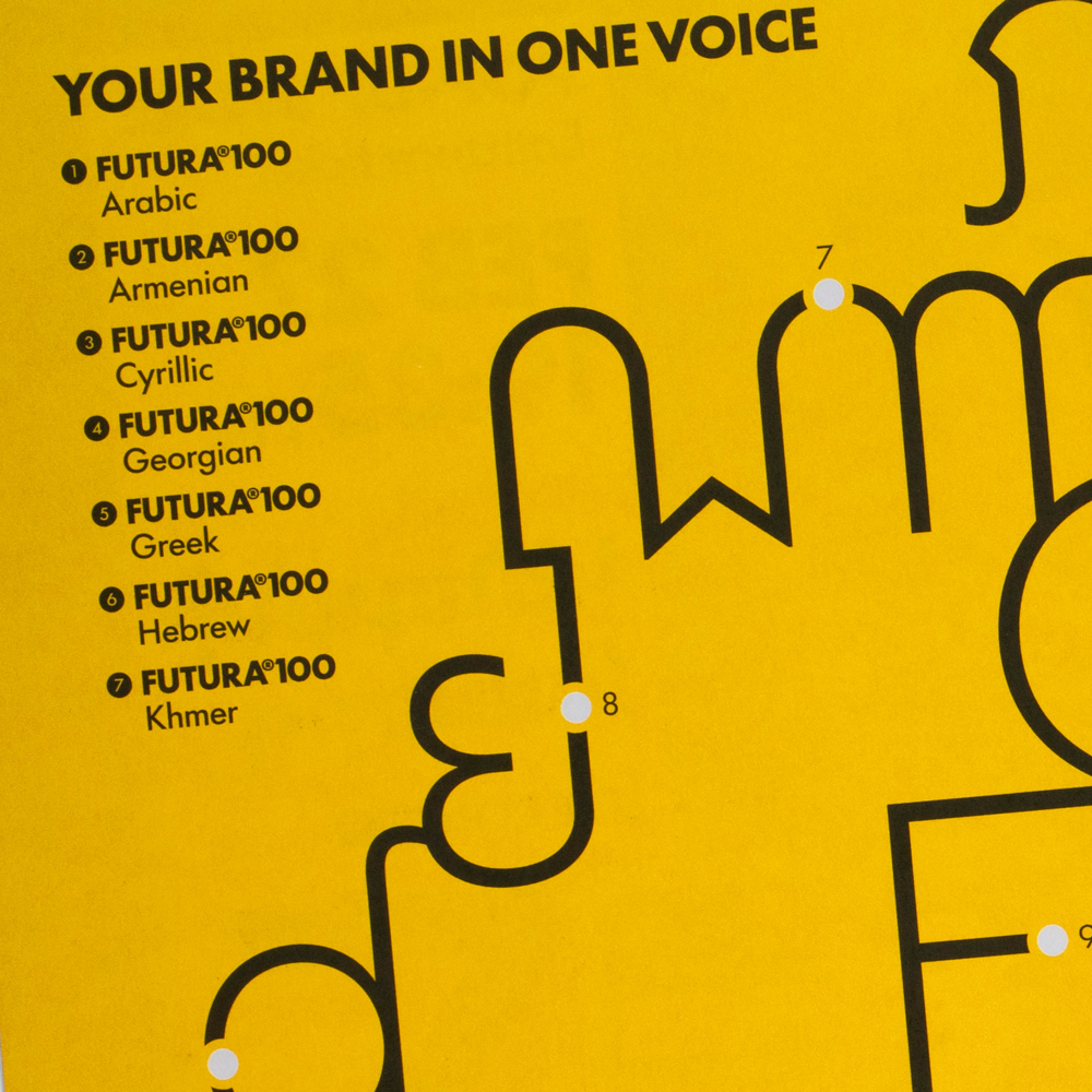 Futura®100 expands Paul Renner’s massively popular geometric sans to 23 scripts for multinational branding, digital devices, and modern publishing demands. To mark Futura®100’s first release of 12 scripts from Arabic to Thai, we commissioned this printed specimen, designed by our talented graphic designer Felicia Priscillya under the supervision of Elena Veguillas. Just cover the shipping/handling and it’s yours for free.