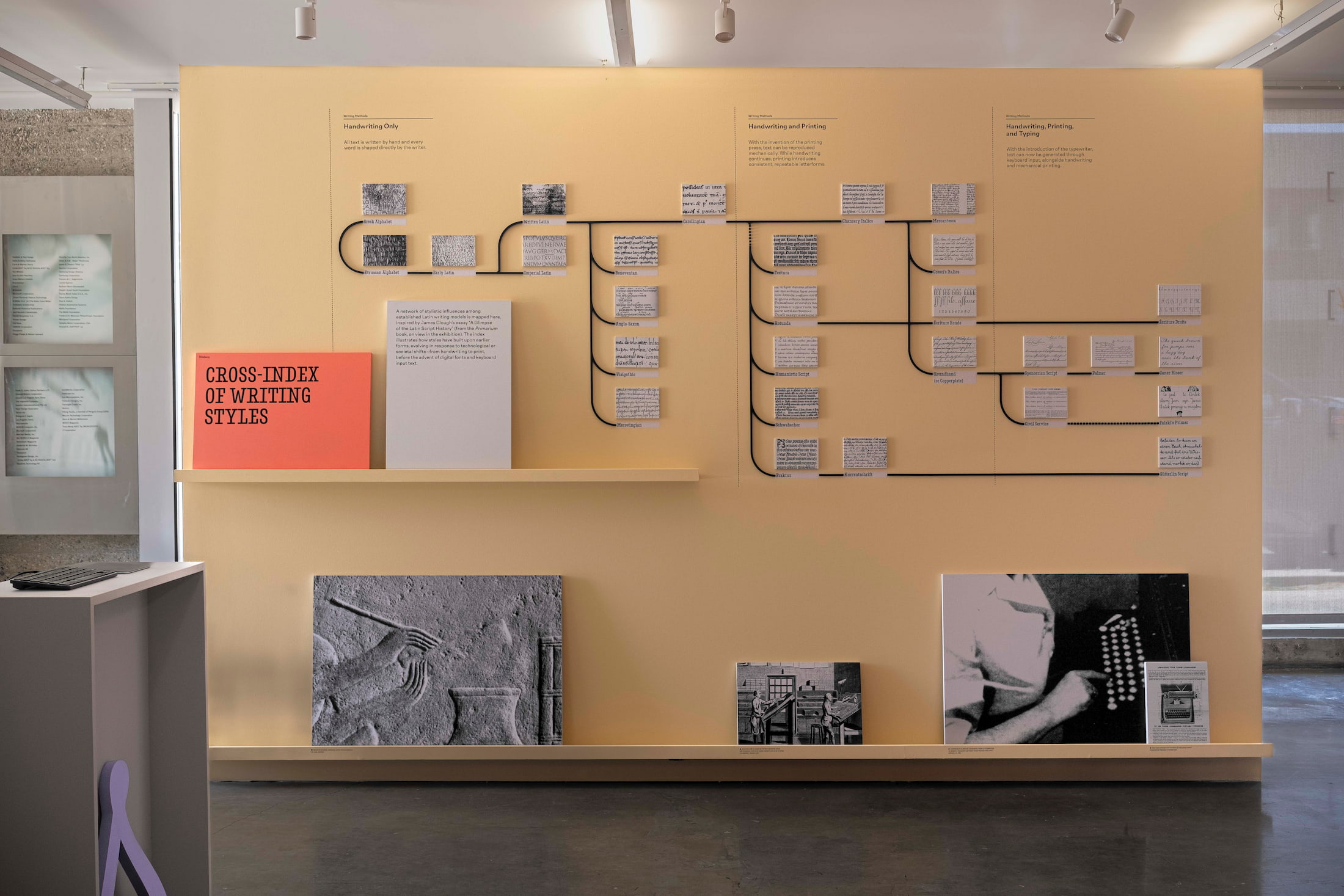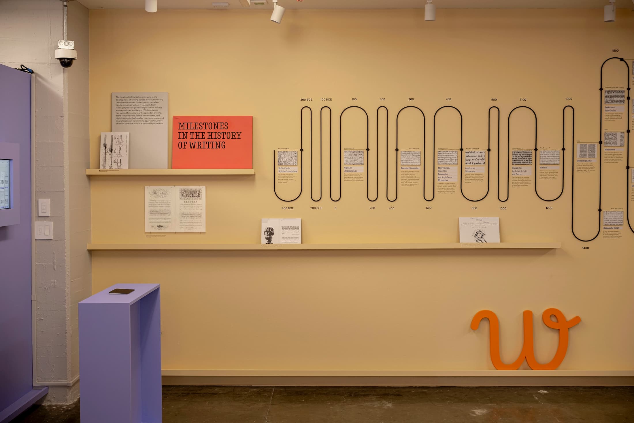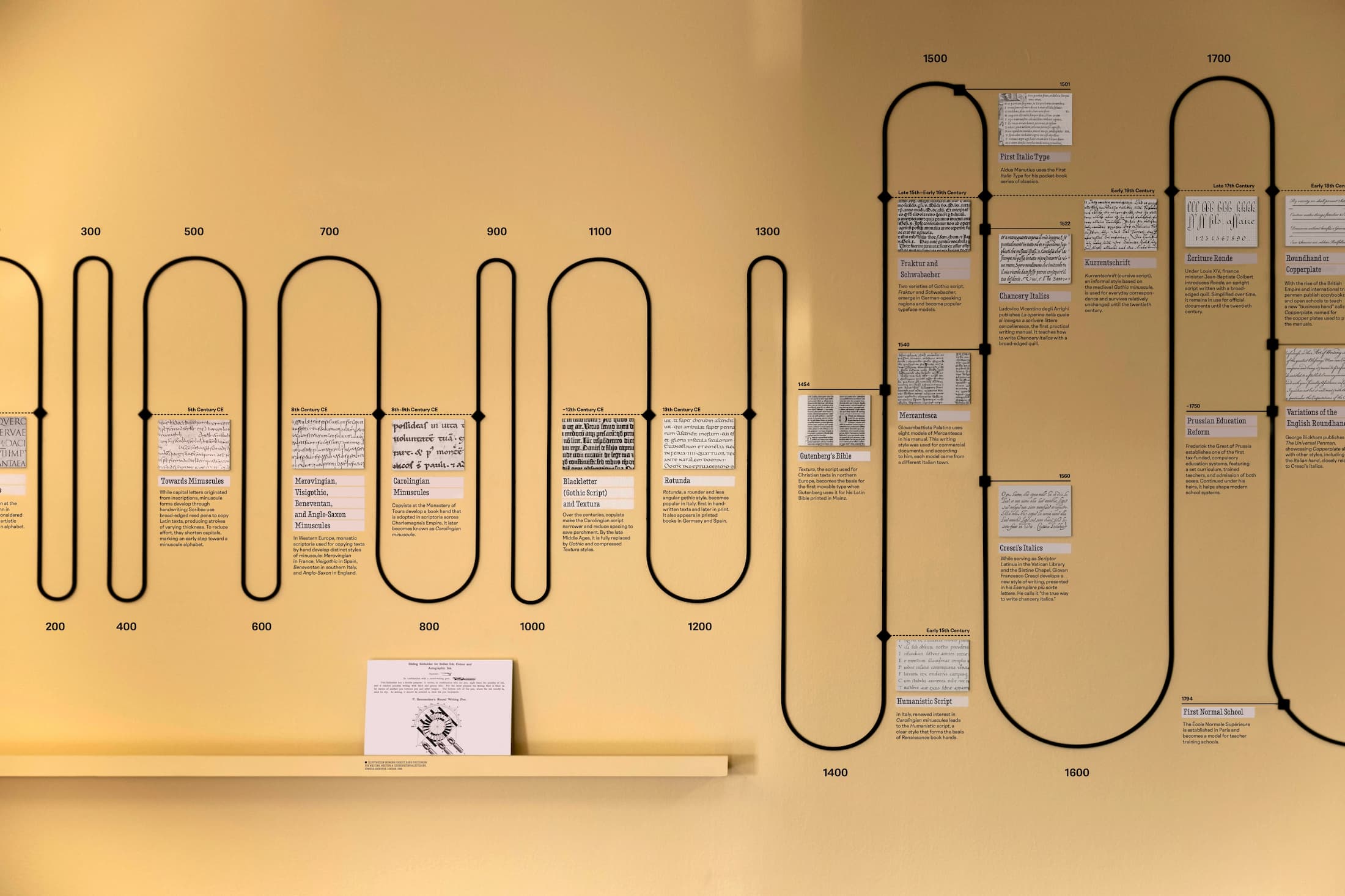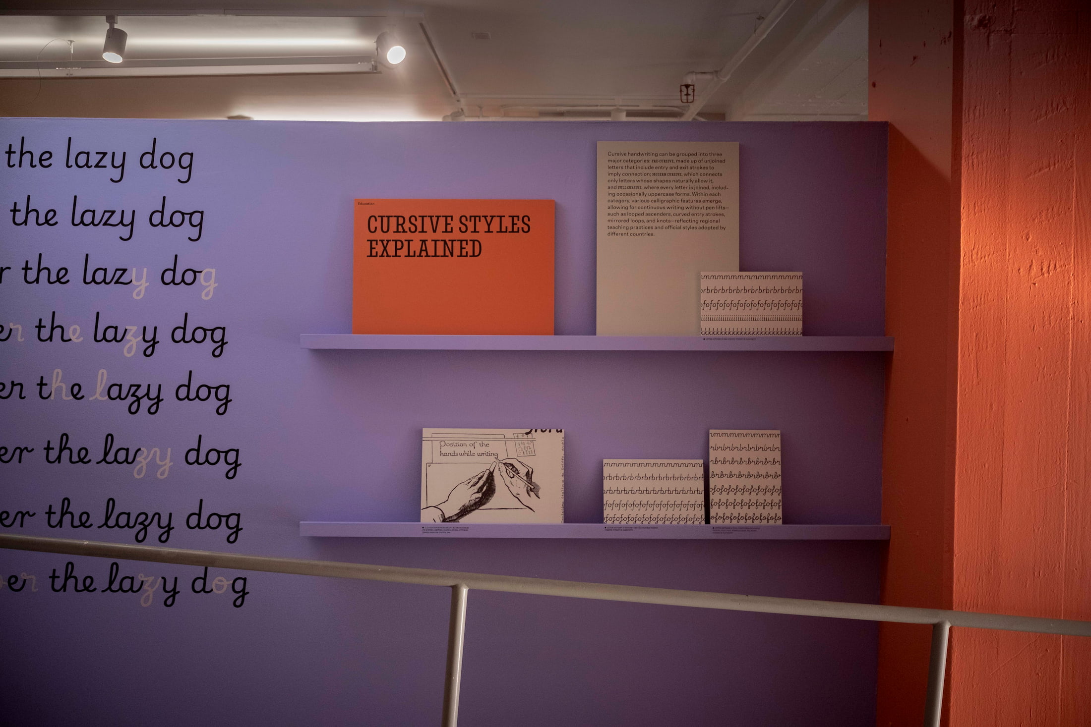 In engaging wall displays and videos, the exhibition tells the story of how cursive writing developed and spread. A particularly engaging timeline charted key milestones in the development of cursive models worldwide from 400 B.C. to present, illustrating how different styles emerged and influenced those that followed. The exhibition also beautifully presented the Playwrite type superfamily, which emerged as one of the products of the Primarium research.